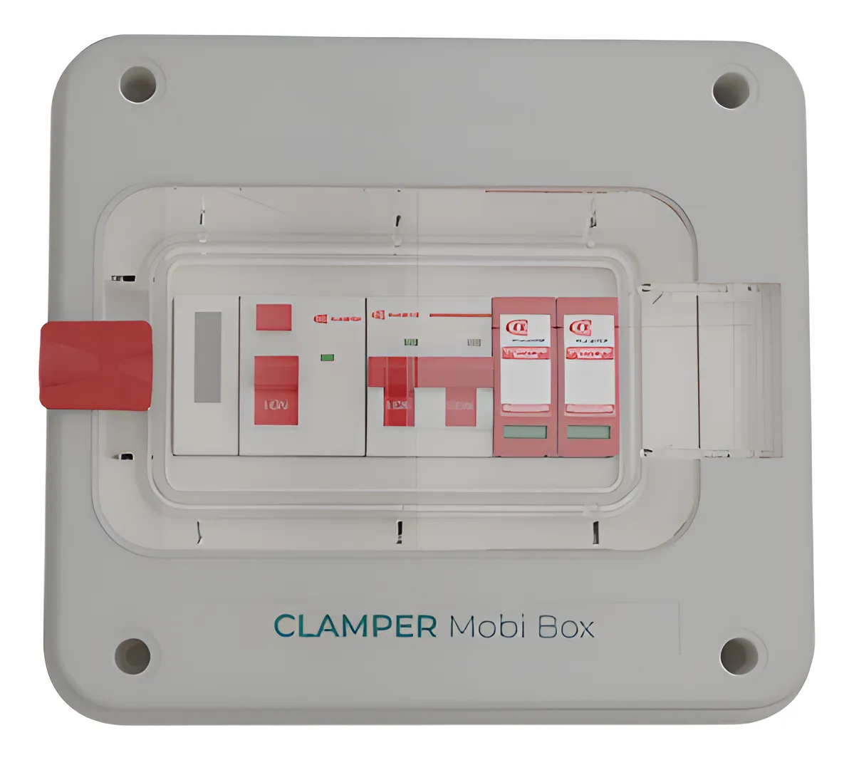 O CLAMPER Mobi Box 220V 8KW C M com Medidor de Consumo é a solução de proteção para carregadores de veículos elétricos com Dispositivo de Proteção contra Surtos (DPS) CLAMPER Front, Interruptor Diferencial Residual (IDR), disjuntor e medidor.